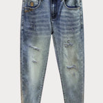 Rock that marble-dyed aesthetic with these heavyweight distressed jeans that refuse to play it safe. Crafted from a breathable cotton-blend fabric with just enough stretch to keep you comfortable all day, they feature authentic distressing and cat's whisker detailing for that perfectly worn-in vibe. The pocketed design keeps your essentials close, while the imported construction ensures quality that lasts. Machine wash cold and tumble dry low to maintain that signature look. Perfect for anyone who wants their denim to tell a story.
