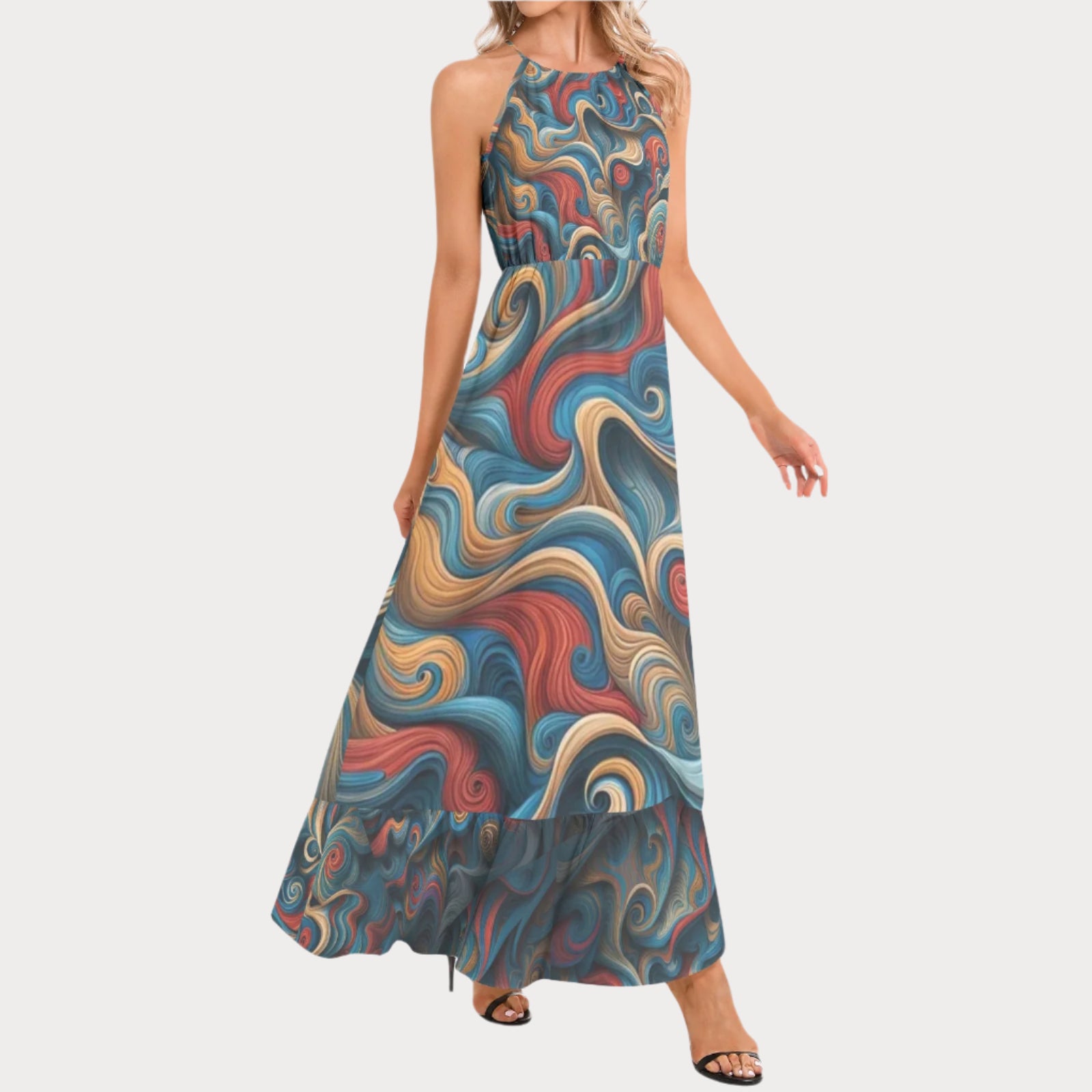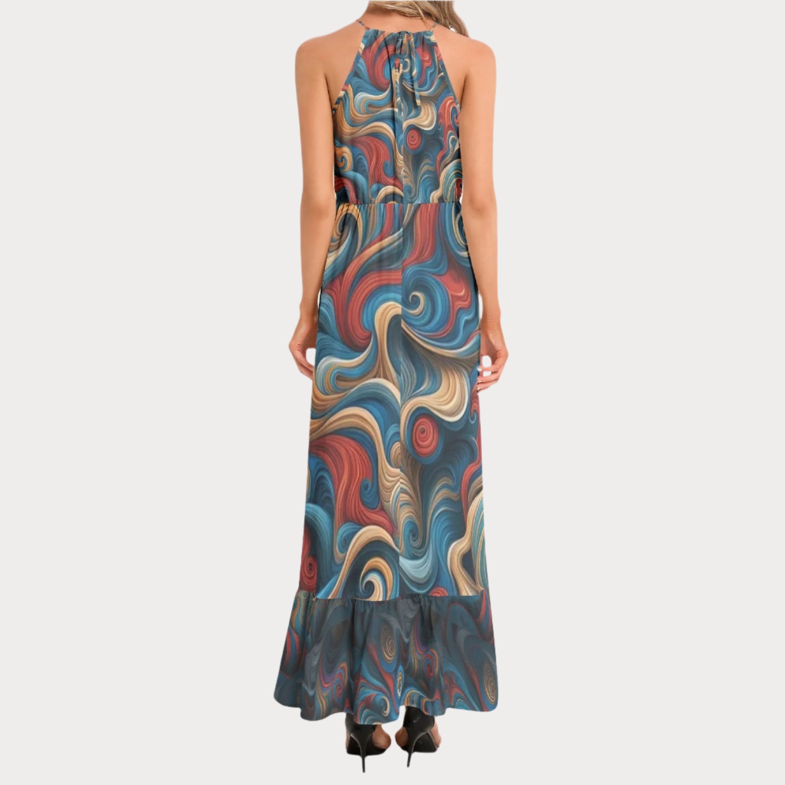 Sleeveless, Halter neck, Tie back, A-Line flared, Ruffle hem, Maxi Dress